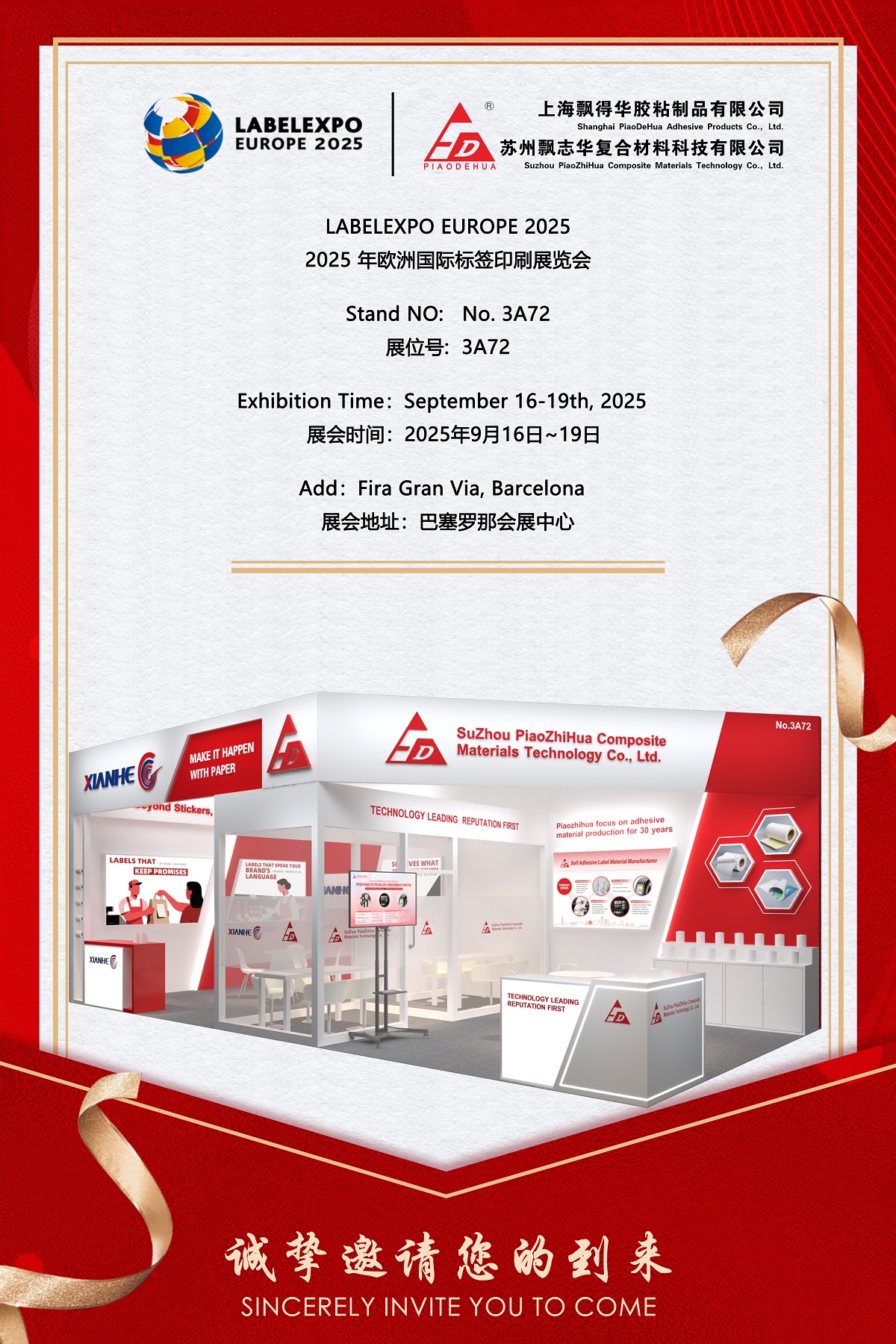 SuZhou PiaoZhiHua Composite Materials Technology Co., Ltd.는 2025년 9월 16일부터 19일까지 스페인 바르셀로나의 Fira Gran Via에서 열리는 라벨 및 포장 인쇄 분야의 선도적인 국제 무역 박람회인 Labelexpo Europe 2025에 참가하게 된 것을 자랑스럽게 생각합니다. 30년 이상의 업계 경험을 바탕으로 신뢰할 수 있는 고성능 자가 접착 라벨 소재 제조업체인 Piaozhihua는 부스에서 혁신적인 제품 포트폴리오를 선보일 예정입니다. 3A72호 . 이번 전시회에서는 소비재, 물류, 산업 부문 전반에 걸쳐 다양한 응용 분야에 맞춰진 첨단 접착 솔루션을 선보일 예정입니다.